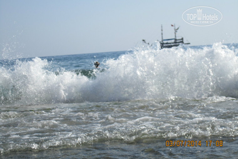 Особый разговор - волны. Очень приятно на них покачаться, желательно, не попав на прибрежную плиту. А в последний день нашего пребывания поднялись сильные волны, и на пляже выставили красный флаг. Но мы глянули, люди купаются, и я тоже решилась, дочь не захотела. Это супер! Главное - войти в море и переплыть плиты. А дальше - э-ге-гей! Многие экстремалы тусовались возле берега - опасненько, когда тебя сбивает бурлящая пенная волна выше головы и носит вперед-назад. Зато адреналина! Главное, чтобы все хороше закончилось. А то одну девушку неудачно бросила волна, и пришлось выносить ее из моря и нести до скорой, наверное-ногу сломала.