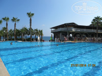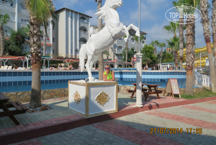 Всем привет, отдыхала в отеле второй раз, первый раз ездила в 2010 году. Поехала снова сюда. Отель достойный. Не самый молодой, но достойный. Выбирая по цене-качеству, не жалею о выборе. За такую-же цену и 4* очень хорошей не найти. Поэтому вполне понимаю принцип отеля - чтобы цена не была слишком высокой экономят на еде. Питание хорошее, свежее, есть всё, но без широкого ассортимента. Приличные котлеты (лучше египетских соевых), курица всегда, мясо 1 раз в неделю, рыба - на любителя. Арбузы сладкие, дыни - не очень, виноград - отличный. Гарниры - вкусные. Зелень, овощи. Наедались. Утром фрэш апельсиновый 1 доллар. Моё мнение, что кто-то очень хочет рейтинг отеля снизить, отзывы некоторые очень друг на друга похожи, совершенно далеки от истины. Расположение отеля - суперское. Виды, пляж, бассейн. До Алании за 2 доллара ездили гулять. Дискотека одна на 2 отеля. Вот, где минус - МУЗЫКА! В Алании на каждом углу доносится из баров и кафе современная музыка. А тут, на дискотеке - непонятно что играет, у бассейна через раз (и то пришлось просить, чтобы выключили группу "Комбинация" 80-лохматого года и Алегрову (младший лейтенант) - жесть.... В общем, чтобы было весело и нравилось молодежи, и тем, кто не спать приехал, нужно раскручивать дискотеку - будет круто. Амфитеатр Гринн Хилла - круче и веселее шоу, можно ходить и гулять там - очень красивая и большая территория. Тут - слабовато. Хороший бар над дискотекой, с 21 до 23 - там можно бесплатно выпивать и танцевать. Сервис: дисциплина 5+, вежливые, терпеливые к перепившим, улыбчивые, дружелюбные, общительные все. Заселились без доплаты: я очень вежливо пообщалась с девочками, просила вид на море, мол, очень надо - у мужа завтра ДР, обещала ему вид на море. Дали 6 этаж. Вид шикарный, но балкон наполовину закрыт навесом, т.е. узковат. Но вид... В целом: цена - качество, расположение и всё-всё, не найдете аналогичное на первой линии, с такими видами, и пляжами. Ходили в аля-карт 1 раз бесплатно - морепродукты-меню, вкусно, приятно. Пиво вкусное, остальное - не разбираюсь. Супруг брал в дьюти-фри, и еще привозили с собой рыбку вяленую, колбаски копченые к пиву, семечки, кириешки - так как этого нет в Турции - пригодилось )))).... Отдельно минусы: музыка, сейф могли бы и бесплатно - 5*как-никак, обеспечить полотенца без денег и матрасы на пляже, варить бесплатный натуральный кофе утром.
