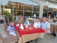 Воспользовались бонусом от отеля, т.к. дни рождения мой и жены подгадали под путевку. Это такое мероприятие:-) заказываешь за день столик (только в главном ресторане на террасе), тебя отводят к нему , отличается он только цветом скатерти и посыпкой цветочками! Я то думал придет официант с меню, нет! иди сам как обычно набирай что будешь кушать, а да, вино он конечно принесет, если нужно что покрепче уж как-то сам в лобби-бар, т.к. не положено, но если принесешь то никто ничего не скажет! Ну конечно песня Хэппи бёздей и вкусный торт с шестью! свечками, независимо от того сколько исполнилось лет! Но мы были настроены позитивно и просто весело покушали на террасе с видом на море!