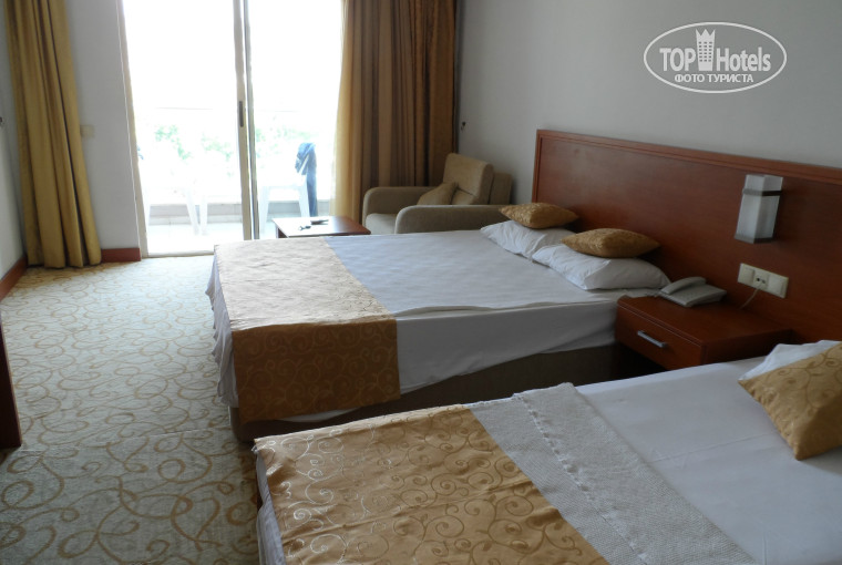 Здравствуйте! Первый раз отдыхали за границей и на море, наш выбор остановился на Турции. Ездили компанией из 6 человек. Отель этот выбрали так как в турагентсве его предложили по скидке, начитались ужасных отзывов и расстроились, но когда прилетели, эти отзывы себя не оправдали. При заселении с 3 пар пришлось дать 30$, так как расселение идет с 14-00, а мы приехали уставшие, голодные в 12 и ждать было заселения ну уж очень трудно., поэтому дали денег. Кормят хорошо, курица рыба, фрукты, арбузы, дыни всегда были, море десертов и различных напитков, на любой вкус вообщем. Номера убирали каждый день, 1 раз за отдых даже цветы принесли в номер. Бассейн большой чистый с 2 горками, катались на них как и дети так и взрослые, анимация каждый вечер, но постоянно одна и та же, мы не ходили на неё так как были постоянно на экскурсиях, экскурсии в Турции просто офигенные, брали их у Османа. При отеле просто ужасный пляж, море камней, то и дело боишься поранится или ногу сломать, мы ходили на пляж правее от своего, там все чистенько и без камней, ездили так же на пляж Клеопатры, от него вообще в восторге. Нам все понравилось, так как мы не привереды и 1 раз на море, положительных впечатлений просто море. Отдых пролетел очень быстро, уезжать совершенно не хотелось! Спасибо!