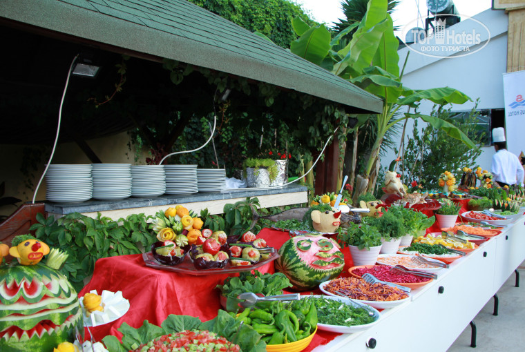Завтрак, обед, ужин - шведский стол; на пляже - лимонад и пиво; около бассейна - бар (лимонад, спиртное, кофе из автомата, сок вроде "юпи", натуральный чай в пакетиках) + турецкие лепешки; вечером 30 минут - мороженое; каждый день - 1 бутылка воды в номер (1,5 литра). В номере электрический чайник и чашки. Чай и сахар можно брать в баре.