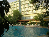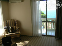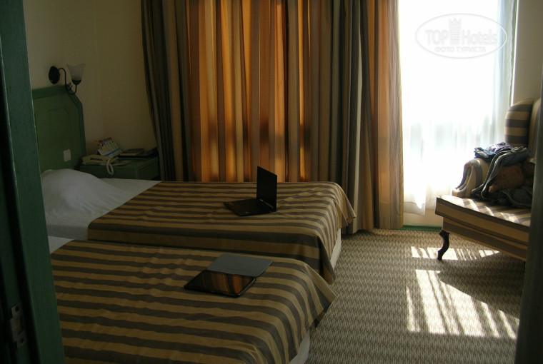Приехали в два часа дня, заселили сразу в номер, указанный в путёвке, без всякой денежки в паспорте — двухкомнатный suite 219. Конечно, номерной фонд давно уже требует ремонта, всё довольно обшарпанное, ковролин на полу просто удручает. Но в целом всё устроило, ванна, хорошая сантехника, телевизор, две стандартные комнаты с межкомнатной дверью, два окна в одной комнате и одно — в другой, выход на балкон есть в обеих комнатах, чудеснейший вид на море. Всё работало исправно. Убирали каждый день, полотенца меняли каждый день. Кондиционер только в одной комнате, что порадовало, его вполне хватало на две, а детей можно уложить спать без кондиционера, чтоб не простывали.