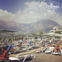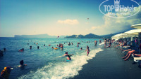 Находится в минутах 7 ходьбы налево от отеля. Когда мы приходили лежаки нашего отеля были всегда заняты, поэтому мы ложились на лежаки отеля Кармир. Все было без проблем) Спокойно отдыхали, и никто нас не выгонял. Море прекрасное, теплое,чистое. Надоедали только люди, которые ходили и предлагали покататься на яхте и т.п. Вообще все они там очень приставучие.