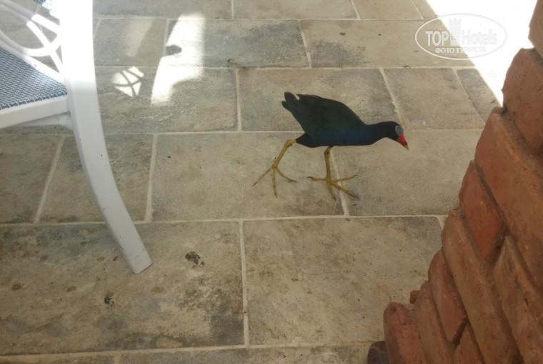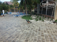 За нашим домиком два пруда,в которых плавают уточки,какие то цапли,рядом ходят павлины.Один паз на камне у озера видели важную черепашку,загорающую на солнышке.Территория отеля в общем чистая,много зелени,есть театр,в котором по вечерам проходят представления,спа,спортивный зал,и еще один бар.На пляже есть ресторанчик,который с 12 до 16 подает обеды,а вечером превращается в "итальянский".Есть теннисный корт неподалеку от ресепшена,там же столы для пинг-понга.На пляже есть сетка для воллейбола,ворота для футбола.
