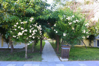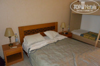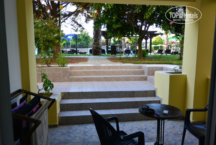 От аэропорта ехать минут 5-7, встретили на ресепшен приветливо, две англоговорящие девушки и Светлана, говорящая на русском. Заселили быстро, достался номер возле бассейна в цокольном этаже. Начитавшись отзывов про комаров и мух привезли с собой фумигатор, но комаров не оказалось в первые дни, воспользовались им позднее. Номера светлые, чистые, но ремонта там давно не было, не мешало бы их освежить. В номере двухспальная кровать и двух-ярусная детская. Перед номером терраса с сушилкой для белья, столиком и стульями, смотрящая на бассейн.