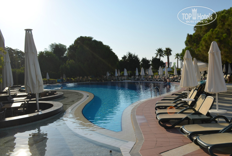 Пляж убирали каждый день, в течение дня выносился мусор. Море было в основном не спокойное. Все прыгали на волнах. Пирса у пляжа нет, но есть большая надувная плюшка метрах в 30 от берега. На ней можно попрыгать и понырять с нее. Иногда ходили на соседний пирс в Глорию и там ныряли. Шезлонгов на пляже очень много, в любое время приходишь, свободное место есть всегда. А вот возле бассейна шезлонги занимаются примерно с 6 утра. Если вы придете часов в 8-9, шезлонгов уже почти нет.Все хорошие места заняты. Возле бассейна в основном иностранцы, как то они не очень любят на море ходить. Анимация в основном тоже проходит только в бассейне. На пляже я видела всего 2 раза анимацию. Т.е. пляж здесь как релакс зона, а в бассейне всегда музыка, анимация.