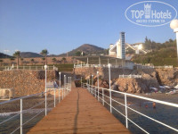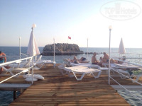 3) пирс с площадкой для загорания, который метров на 50 уходит в море, с 15-20 лежаками и зонтиками, на нем приятнее всего загорать с 8 до 12, пока солнце еще не слишком высоко; с него же есть лесенка-спуск в воду (которая здесь, кстати, гораздо более чистая, чем у берега - сюда волнами не прибивает водоросли)