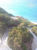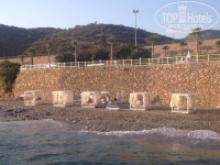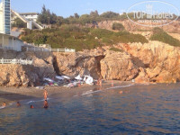 Пляж очень необычный (не ждите традиционной песчаной полосы с лежаками, расставленными ровными рядами), частный. Из-за того, что отель расположен на горе, пляж тоже окружен скалами. Всю загорально-купальную территорию (позвольте мне так ее назвать) можно поделить на 3 части: 1)левая часть пляжа(отделена от правой лестницей, которая спускается от самого моста к бару и дальше-к пляжу) - небольшая песчаная площадь с пологим входом в воду (вода, в целом, чистая, но периодически приносило водоросли); там стоят лежаки и несколько зонтиков, не очень много места и за порядком особо не следят, так что многие зонтики поломаны, матрасы некоторые рваные (правда пару раз все таки наводили порядок, но наши нерадивые отдыхающие снова оставляли после себя беспорядок); 2) правая часть пляжа - гораздо более аккуратная территория, где стоят лежаки, а так же небольшие сооружения, похожие на кровати со шторками (см фото), рассчитанные на 2 лежака (их около 5 штук), в них приятно прятаться от палящего солнца; с этой стороны больше камней-булыжников и вход в море-каменная плита, которая уходит далеко в воду и не даст вам зайти больше, чем по пояс