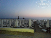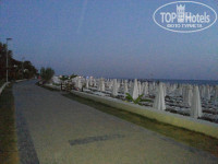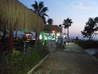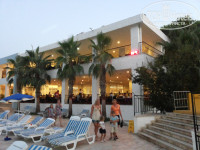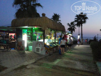 от корпусов до моря идти максимум 5-7 минут и это классно, когда захотел, тогда и пошёл искупался и не надо зависеть от автобуса привозящего и увозящего отдыхающих. Пляж у Ларисы не более 100 метров, это там где стоят лежаки с полосатыми матрасами и стоят они впритык друг к другу , но это не сильно и страшно мы приходили часам к 9 и место находили всегда. Вход в море мелкий песок и надо идти метром 150 чтобы зайти по плечи в воду и вода не очень чистая. Мы ходили купаться на пляж левее от Ларисы-там супер чистая вода и волны бывают на которых класс можно поплескаться и там водоросли не убирают а просто сгребают в кучу и не очень и от этого на пляже стоит запах гниющих водорослей и самое главное в море будьте готовы к тому что вас нежно и не очень может укусить то-ли за пятку то-ли за щиколотку рыбёшка, но это не сильно больно, главное чтоб на ногах не было ранок и порезов, а так не стойте в воде - двигайтесь и они вас не тронут. Перед пляжем есть бар от Ларисы , в нём холодное пиво, напитки и пару часов в день жарит женщина лепёшки с разными начинками и в обеденное время можно взять "типа гамбургер" , картофель фри и салаты овощные. Перед пляжем есть променад по которому можно прогуляться вдоль прекрасных отелей и не очень прямо до античного города- Сиде, но это около часа так что рассчитывайте свои силы, а так в Сиде и Манавгат можно доехать на приличных маршрутках в Сиде -1 $; в Манавгат -1,5 $. В Манавгате есть рынок промтоваров и рынок где продают овощи и фрукты которые дешевле на порядок чем в баре при пляже: Клубника-3 $, груши-2 $,виноград-2 $, персики-3 $ ,отварная кукуруза - 1$ и всё вкусное и сладкое.В Манавгате есть супермаркет Мигрос в котором по хорошим ценам можно приобрести воду,напитки или другие продукты питания.
