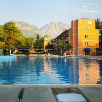 Территория. Это просто нереально красивый вид на горы, лес на которые можно смотреть вечность. Пальмы, цветы, газон все ухожено и красиво. Бассейн тоже красивый и большой, есть где поплавать. Есть горка, где тоже можно весело провести время.