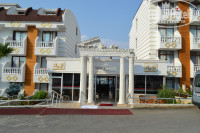 минус №8- пляжа своего нет . есть общественный пляж с бесплатными шезлонгами , три первых ряда шезлонгов . Но при этом они навязывают на пляже напитки ,намного дороже чем в магазине (например 1 литр воды за 4 лиры , в магазине за 1 лиру ) этот пляж находится сразу у дороги которая к морю от отеля ведет ,слева от зеленых шезлонгов . спуск крутой очень ,соответственно и подъем тоже ,но нас это не напрягало .можно пройти по другой дороге ,там спуск более пологий - если от отеля дойти до главной дороги -там на перекрестке продают экскурсии , и повернуть направо ,дойти до подземного перехода и по нему перейти дорогу будет спуск более пологий .