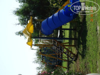территория не совсем большая,но нас это вообще не беспокоило.на территории есть детская площадка,газон,бассейн с горкой и детский бассейн.лежаки,зонты и пр.