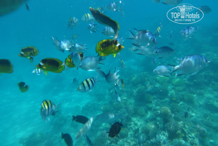 То что пляж маленький и не на один отель - это я, конечно, знала, но вот чтобы стоооолько арабских семей плавало - это раздражало жутко! Вот встанет по шею в воду несколько семей из 7-9 человек и стоят разговаривают, не проплывешь в открытое море. Поваляться и поплавать можно хоть слева, хоть справа от пляжа, но заходить и выходить на далекие плаванья хочется-то через свой! Сам подводный мир у пляжа нравится очень! Рыбок повстречаете много, кто с маской плавает.