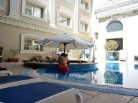 В номере было чисто и уютно, оформлен в современном стиле,2 зеркала, стол, 2 кровати достаточно широкие, кресло со столиком, плазма (первый канал показывал всегда), кондиционер (работал отлично). В ванной комнате душ, огромное зеркало, чистые полотенца, мыло и фен. Горячая вода была всегда. Окна из номера выходили на бассейн, и было всегда тихо, никто не мешал выспаться.В общем все что связано с номером, очень понравилось. Питьевой воды в номере не было, поэтому покупали в соседнем магазине.