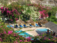 Вид из окна отеля открывается очень красивый, ухоженный бассейн весь в цветах, море, синеющее в далеке...