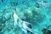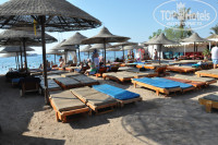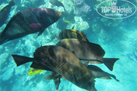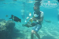 Пляж неудобный, очень маленький, ближе к обеду его заполоняют арабы. Поэтому лучше ездить на самых ранних автобусах, пока еще много мест и народу мало. Заход в море песчаный, но нужно смотреть под ноги, чтобы не наступить на коралл. Рыбки плавают рядом с берегом, кому надо, тот отплывает чуть дальше в маске и любуется. Рыб не шикарно много, мы видели и больше (например, в отеле Корал Бич Ротана Монтаза в Шарм-эль-Шейхе, рядом с отелем Барон, напротив острова Тиран)). Точней, мой муж видела, я не любитель снорклинга.