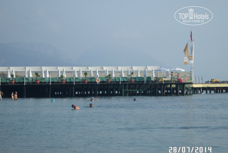 Море: Водная акватория как бы зажата между 2 пирсами, на обоих есть зонтики и лежаки. Наличие двух пирсов позволяет вообще не заходить в воду с берега, с одного спускаешься, отдохнешь на плотике и поднимаешься на другом. Между левым пирсом и плотиком на глубине есть камень, на котором можно постоять, если нет волн. Купались только в море.