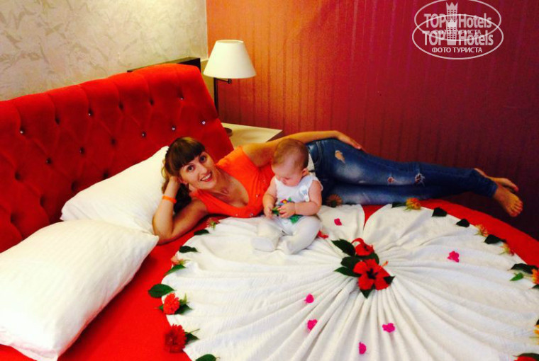 Так и вышло после завтрака нас проводили в номер который нас очень сильно удивил. Хочу сразу отметить , что номера в отеле на твёрдую пятерку. Как позже выяснилось нам приготовили номер с круглой красной кроватью для молодоженов. на которой очень красиво было выложено покрывало с цветами.
