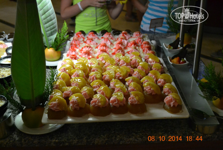 Питание отличное! Всегда была рыба- и на обед, и на ужин. Мясные блюда, закуски, гарниры, десерты- в изобилии!!! Шоколад на завтрак- это чудо! Напитки отличались в основном ресторане, барах и на пляже ( особенно...) и по вкусу и по крепости... Но чаевые бармену решают вопрос. Из автоматов наливался не сок ( как написано на указателе), а что то похожее на Yuppi...- "усы" цветные у детей оставались после "сока".
