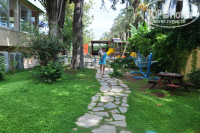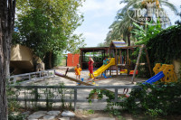 Есть небольшая детская площадка с качелями и горкой. Рядом с ней беседка, играющая роль мини-клуба.
