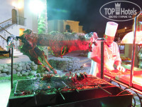 Рестораны по записи; La Trattoria (итальянский над главным рестораном) запись на обед или ужин, мы ходили два раза, делают оч. вкусную пиццу., Рестораны Fatima и Barracuda находятся на верхнем ярусе пляжа с видом на море днем работают как снек бар можно перекусить картошкой, бургерами , пиццей, салатами….А вечером по записи обычно на через день записывают, подают шашлычки на мангале и жареную рыбу, можно заказать креветки платно. Приятная тихая обстановка в отличии от главного ресторана где с открытия сносят двери чтоб первыми попасть, а если позже приходить то надо ходить с тарелкой искать свободный столик.