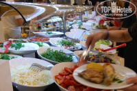 Кормят вкусно, вполне разнообразно, но иногда бывало островато, особенно супы. Рыбу дают не часто, в основном курица, телятина, индейка. Есть диетические блюда, приготовленные без специй, отварные или на пару. Кофе из автомата, приемлемый, соки разводные тоже из автомата. Красное вино нормальное, наливают из бутылок. Обслуживают вежливо, почти всегда своевременно, особенно если столик на виду, а если угловые и далеко, то могут и не заметить. Ресторан нафоткала много, представление составить можно.