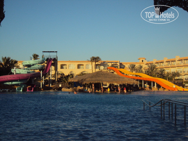 Территория отеля. Большая, красивая. Но за отелем - ужас. Одни недостроенные отели стоят. Набережная сделана красивая, мы брали электромобили и катались по ней. Еще брали велосипеды напрокат и ездили прям до въезда в п.Сахл Хашиш (там, где фараоны стоят). Бассейны большие. Один с подогревом (там где горки), один ледяной. Там никто и не купался.