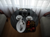Проживание. Номер на 8м этаже класса Delux с видом на море. Отличная система кондиционирования, порадовала уборка номеров и ежедневная замена полотенец и постельного белья. Каждые три дня приносили корзинку со свежими разнообразными фруктами. Бесплатные чай, кофе, вода. В номере есть электрический чайник, фен, телевизор (прим. есть "Первый канал", остальные на вьетнамском языке). Тапочки, халаты, сланцы, нитки с иголками, шапочка для душа, мыльные принадлежности и т.п. К сожалению, в номере не оказалось рейлингов для сушки одежды.