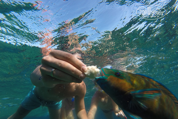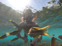 Идти далековато, но оно того стоит. Очень много рыб, взяли пол булки на завтраке, спрятали от "спасателя" в кармане и в тихаря подкармливали, они сбегаются отовсюду! :) Зрелище неописуемое!!!