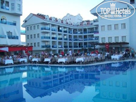 Отель очень хороший, новый, красивый. Всё понравилось кроме размещения. На ресепшене два раза пытались нас поселить в двухместный номер вместо оплаченного трехместного.Только после двух попыток и объяснения на английском языке дали трехместный.Русский почти никто не знает.Все расчитано на немцев,которых большинство. Советую взять русско-турецкий разговорник. Питание хорошее, обильное, много фруктов(яблоки,виноград,дыня,арбуз,сливы. Очень понравилось пиво, вино не очень. Мясо в основном курица, но много. Номера чистые, убираются хорошо.Море и пляж чистые. Шезлонгов иногда не хватает у бассейна и на пляже после 10.00. Нужно занимать с 8.00.Пляжные полотенца сколько хотите с 9.00 до 11.00,при их утере не штрафуют.Отель хорош для семейного отдыха, правда анимация на немецком языке. Вообщем этот отель отель хорошее место для тех,кто приехал отдыхать, а не придираться (некоторые русские недовльны отсутствием борща и свинины. Простите это же ТУРЦИЯ!.Персонал вежливый ,всегда улыбается.Всем советую этот отель.