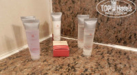 В банный набор входят: шапочка для душа, шампунь с кондиционером (вполне нормальные, зря только бальзам для волос везла) и гель для душа.