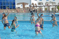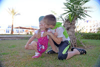Моё утро началось с того, что я проснулась ещё до того, как прозвенел будильник. Часов в шесть. Я осмотрелась по сторонам, вроде никто меня не будил. Оказывается, это комары. Почему я их с вечера не заметила, не понятно. Нас поселили на первом этаже. Очень удобно тем, что есть две двери из номера. Одна выходит на детскую площадку, а другая на бассейн. Кстати, в первое утро я заметила, что в такую рань работники отеля уже на ногах, они чистят бассейн и играла по всей округе арабская музыка. Её было еле слышно только со стороны детской площадки. Включаю телевизор. Было несколько русских каналов. Совсем скоро звонит будильник, и я иду будить детей. Такого я ещё не видела. Обычно, просыпаясь в школу, они нехотя пробуждаются. А здесь они тут как тут! Скорее умываются, чистят зубы. Кстати чистить зубы водой из под крана нельзя. Нас об этом сразу предупредили. В номере есть достаточно бутилированной воды по 0,5 литра, которую можно использовать не только для питья, но и для чистки зубов. Уже потом, купаясь в ванне, я заметила, что вода слабооранжевого цвета. По привычке решила постирать белое нижнее бельё. И зря. Оно стало оранжевым и ничем потом не отстиралось. Эта привычка была пресечена при первой же попытке и больше не вспоминалась. Чемоданов хватит, чтобы ничего не стирать. Мы взяли с собой полотенца. За столько километров тащили на своих плечах! Такого сервиса мы не ожидали. Вот что значит, первый раз отдыхать, когда всё включено.