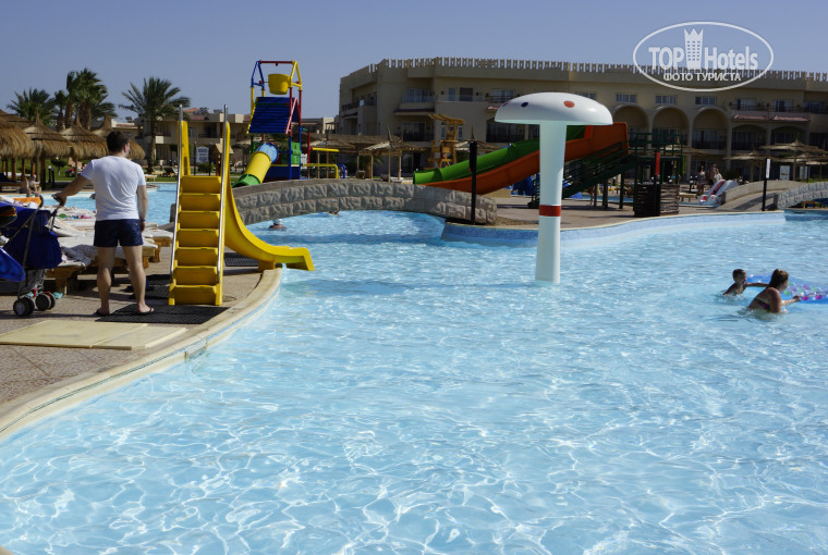 Отдыхали с мужем в этом отеле. Очень большой отель с ухоженной территорией. Но очень старые номера. Заселились с третьего раза, т.к. два предыдущих номера не понравились. На третий раз заплатили на ресепшене, чтобы заселили в более ли менее нормальный номер. Наш номер был 1464 - я счетаю, что это наиболее удачный номер- располагался на третьем этаже. Вид из окна на бассейн. Но все равно номер очень старый. Белье сушить совершенно негде. Развешивали купальники на ручках шкафа. В туалете была очень странная душевая - перегародка была только частично и после принятия душа было много воды на полу за пределами душевой. Сам душ был тоже старый и из него "била" очень сильная струя, было больно кожу. Душ не регулировался. Питание было супер!!!! Пять ресторанов, один из них "Суши ресторан" на ремонте. Мы много где побывали и есть с чем сравнить. После 16-00 еще делали пончики и блины с разными начинками. Также было coffe кафе, которое работало круглосуточно - классное кофе там можно было попить, также горячий шоколад и многое другое. Бассейнов было очень много - вода там очень и очень холодная была. Плавали после обеда.. Только один детский был с подогревом. Анимация была очень классная! Вечером была живая музыка и разные шоу. Возили также на дискотеку в разные клубы. Были в Хард рок - ужасно просто, нам не понравилось. Еще были в Литл Будда - там понравилось больше. В море купались один раз. Море теплое, но вход просто ужасный. Много ежей и коралов. С понтона тоже не прыгнуть в воду. По понтону идти примерно 800 м. Экскурсии: Голубая бездна - не понравилось, т.к. долго ехать, везде стоит конвой с автоматами, потом визли по пустыне, посетили цветной каньон (шли по ущелью примерно 30 минут, ничего интересного, местные жители приставали, чтобы мы у них что нибудь купили, потом привезли к морю, брали две маски на прокат - обе заполнялись водой). очень опасно плыть под водой, большое количество медуз. потом кормили обедом - за обедом под столами было большое количество кошек и летали мухи. потом везли на верблюдах за которыми никто не следил. мой верблюд вообще стал легаться на проходящую мимо собаку. Вообщем не получили удовольствия. Также ездили на мега сафари (катание на квадрациклах, катание на банане и таблетке и ездили на баггах (машина двух или четырех местная без дверей). Больше понравилось на квадрациклах. В отеле каждый вечер анимационная команда поздравляли с днем рождения имениннеков отеля. Был большой торт и каждому пели песню "С днем рождения". Еще в отеле есть аквапарк - здоровский!!! Вообщем инфраструктура отеля очень понравилась. Очень жаль, что отель очень старый. Больше в этот отель не поеду из-за моря и состояния номеров.