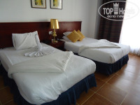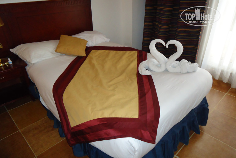 В отеле отдыхали вчетвером, занимали два номера – 155 (с двумя отдельными кроватями) и 363 (одна кровать). При заселении нам предоставили 154 и 155 номера, но в 154 две кровати и мы попросили заменить номер. Все заменили без проблем, также без проблем заменили занавеску в ванной, т.к она не доставала до бортика ванны несколько см. Номер состоит из 2-х комнат, ванной и балкона (на первом этаже терраса, выходящая к бассейну). В номере сразу было 20 бутылок питьевой воды (сразу на весь срок пребывания 10 дней на двоих), 2 бутылки колы, чай, кофе, сахар. Шампуней, гелей и др. принадлежностей для ванной нет. Номер хороший, но ванная требует ремонта, а также полотенца поистрепались совсем(