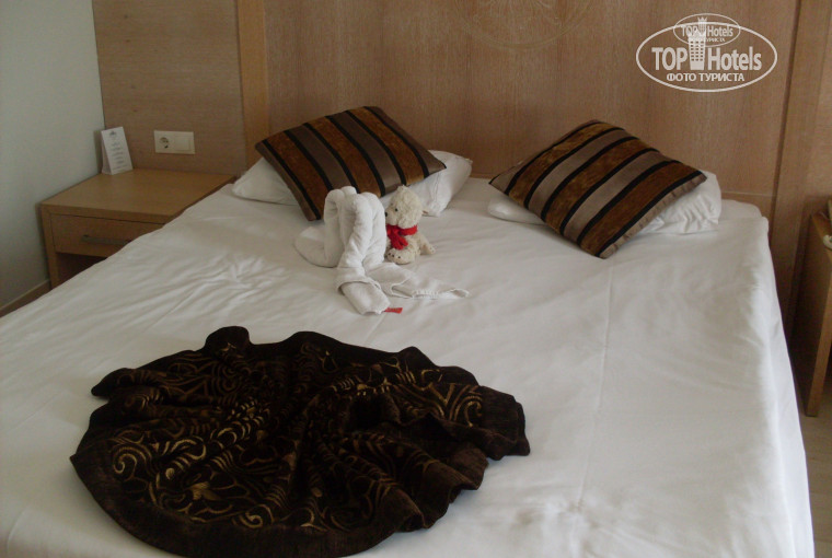 Отель отличный. В Турции отдыхали второй раз. В июле 2014 года.. Я и двое детей. Приехали мы ночью. В 3 ч.. Заселили тут же, даже и 5 минут не ждали, Оформили, одели нам браслеты. Спросили при этом -"Не голодны ли вы??!" Есть мы не хотели, хотели только спать..В номере все чисто. Большая кровать, двухспальная, и односпальная...также в номере есть сейф, за который мы оставили залог 10 евро (при выезде отдали нам эти деньги).. Но не забудьте, не выкиньте квитанцию.. Потому что по ней вам потом отдадут деньги назад...Вот только я забыла уже платили мы за пользованием сейфом или нет... так что врать не буду...В номере есть также: чайник, чай в пакетиках( хотя чай мы так и не пили, хватало всего что за весь день пили), маленький холодильник в шкафу, в нем бесплатно вода в бутылках, и соки с трубочками детям... По мере того как выпьем их, обновлялось все. В ванной есть фен, гель для душа.. Полотенца обновлялись по мере их загрязнения, если кинешь на пол...но чистые, белые...Персонал дружелюбный, разговаривает в основном на немецком, английском и немного на русском...аниматоры есть русские ...Вообще скучать они никогда нам не давали..Детям развлечение кажд день... Вечерами каждый день новое развлечение. Очень интересное. То турецкая ночь, то цирк, то много чего!!! Питание отличное..Мясо различное.... Огромный выбор булочных изделий... Всего не перечислишь конечно.... Даже были суши.... огромный выбор тортов и пирожных... Ну каждому найдется что поесть.. На пляже тоже всегда еда... На обед порой не ходили, ели на пляже... Выбор поменьше, но голодным не останешься...Территория отеля большая... 5 бассейнов... включая детский и с горками...Все чисто.... Полотенца можно с утра брать и потом сдавать их, как мы и делали... Полотенца выдаются по специальным картам, которые выдали сразу при въезде в отель..Пляж отличный, песчаный.. Вход в море тоже песчаный.... и удобно для детей, не глубоко... Далеко идти чтоб глубоко было... Когда мы были, много дней были волны, так что покатались на волнах... Было супер!! .При выборе отеля, я тоже перечитала много отзывов... и плюсом было то, что пляж и в море песок..... Да, от отеля идти до моря недалеко , минут 3-5, по ровной асфальтированной дороге вдоль отелей.... не заблудиться!!.............. Хочу в этот отель снова!!!!!!
