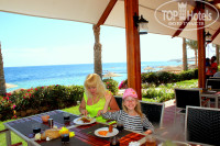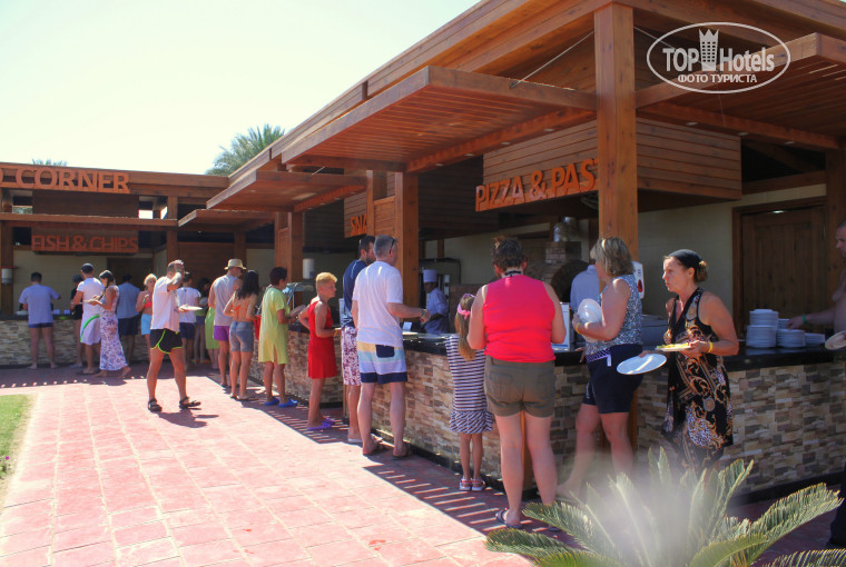 А так два понтона и красивый риф...пока идешь рыбок можно и без маски увидеть..Так познакомились с местной достопримечательностью, рыбкой Васей...понаблюдали за ним, ребенка позабавили..и потом пошли на обед в главный ресторан......Хотя можно пообедать прямо у моря, в ресторанчике Блю Бей..но в нем нет супчиков и выбор скромный по сравнению с главным..не было вкусняшек, была только пицца, но в баре, было мороженное и очень красивый вид окрывался на море с обеденной зоны.....