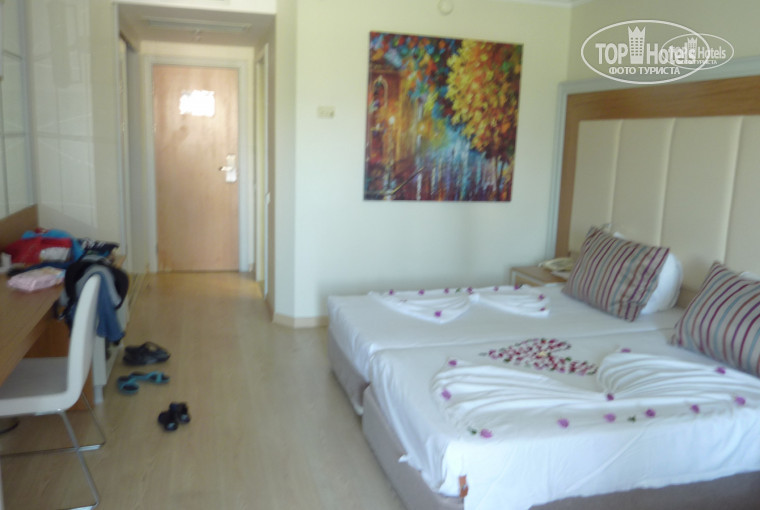 Автобус привез нас в отель примерно в 10:00 дня. Мы отдали паспорта для оформления и попросили предоставить номер до 12 часов, т.к. дети, да и мы били измотаны дорогой (как всегда рейс задержали). Попросили один номер на всех. И, о чудо, дали нам его без проблем, да еще и без всяких доплат. В дальнейшем этот же номере и остался за нами, а друзей переселили в соседний. Сейчас уже не вспомню какие номера были, они находились на втором этаже, если выходить из лифта с права самый первые по левой стороне. Окна выходили на дорогу. Могу сразу сказать шума от проезжающих авто не было, точнее он был но не критичный и вид был отличный - на горы. Через пару дней мы даже очень обрадовались, что нам дали номер с видом, как у нас говорят "во двор". Объясню почему, наша сторона была в тени ближе к обеденному времени и мы не пользовались кондеем, что способствовало хорошему отдыху без простуд, и дети спали отлично и днем и ночью.