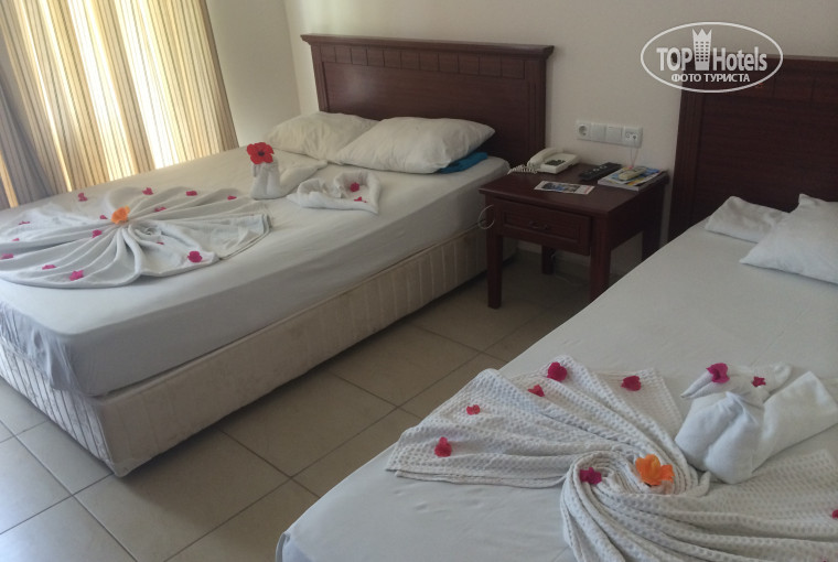 По порядку, прибыли в отель мы часов в 10 утра, нам сказали ждать 2х, потом заселят. Любезно предложили переодеться и оставить вещи на ресепшен. Готовы мы к такому не были, чемоданы в пленке, нужные вещи распиханы в разных местах, и очень хотелось лечь (ночной перелет дался трудно). Пожевали сопли, вложили 20-30$ в паспорта и пошли на ресепшен. За деньги нас согласились заселить сразу, остальные сидели и ждали двух. Я наивно полагала, что нас и заселят в хороший номер, но нас заселили в одноэтажный корпус (типа бунгало), внутри номер неплохой, 2 кровати(2х и 1,5 спальная), столик, шкаф, холодильник, тумбочка, кондиционер. Когда мы пришли, в номере убиралась очень приятная, ни слова не понимающая по русски, но очень улыбчивая женщина. Встречала как родных. Скажу наперед, она убиралась у нас каждый день, оставляли чаевые, крутила лебедей из полотенец, которые правда менялись не каждый день, а на усмотрение уборщицы. Зато на кровати оставляла живые цветы, нам нравилось, в общем! Кондиционер работал, душ работал странно, постоянно то лилась ледяная вода, то кипяток. У нас была душевая кабина, в других корпусах видела ванны. Из плюсов еще то, что не пахло канализацией.