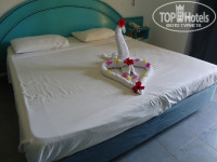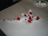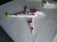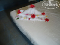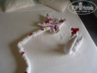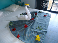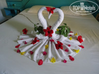 3. Размещения и номера. Что и говорить, отель не новый. Тем более это Египет, опять же 4 звезды. Опять же кто за чем едет. Если вы едете сидеть целый день в номере в атмосфере роскоши с плазменной панелью и кучей каналов, то вам точно не в этот отель. Мебель старенькая, но чтобы сложить носки с трусами и повесить рубашки, а также поваляться на кровати вполне удовлетворяет. По телеку два русских канала (1-й и новостной). Мой же смотрел какой-то японский с круглосуточными мультиками. В анкете, которую раздали на собрании указал, что брызгает душ во все стороны. Именно не сломан, а брызгает. Не бегал, не скандалил, а просто написал. Вечером придя с моря с удивлением заметил, что лейка душа заменена на новую. Также делал отметку, что в номере шумно (расположен рядом с дорогой и при открытой двери, особенно ночью, когда проезжают автобусы действительно шумно). Предложили другой номер, отвезли, показали, но я сам решил, что гораздо сложнее собрать распакованные вещи и перетащить их, чем поменять "шило на мыло". Проблема решилась простым закрыванием двери на ночь. На мой взгляд все номера (за исключением бунгало, но за это будьте добры 15 баксов в сутки) более-менее примерно одинаковы и различаются только более ближним или дальним (т.к. территория огромная) расположением к морю, бассейнам, ресторану, магазинам и т.д. Идеальных нет, все равно вы будете или ближе или дальше к тому или иному месту. Опять же, кто за чем едет. Могу сказать, что несмотря на то, что территория действительно огромная, я с 4-х летним ребенком никакого дискомфорта в этом не чувствовал. Опять же нормальные физические нагрузки в виде ходьбы после обильных возлияний и набиваний желудка в ресторане будут только на пользу. Через день оставлял по баксу чаевых уборщику. За 11 дней пребывания каждый день на постели была новая красивая фигурка с цветами.