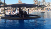 3. Оставив вещи, мы пошли на море. Вот там нас ждал "сюрприз", ввиду практически его отсутствия. Ну не могу я этот маленький кусочек заводи назвать морем! К слову, по пути на пляж мы прошли мимо бассейна- большого и чистого, внутри которого интересно расположен бар. Сам пляж тоже весьма приличный- лежаков и зонтов хватало всегда, полотенца пляжные давали всегда чистые, а под конец так вообще новые. Возле пляжа также есть бар. На пляже есть кабинетик спа, а также продают экскурсии.