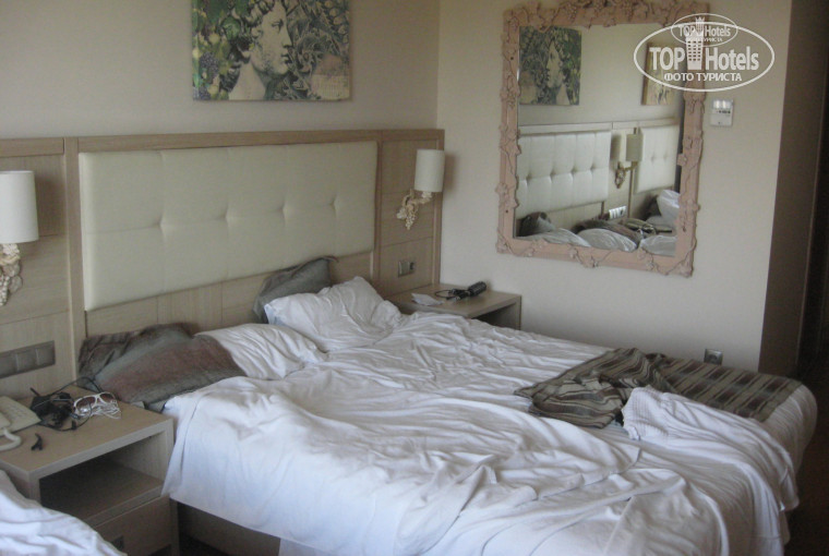 Номер. Жили мы в основном корпусе на 3 этаже. Вид на лужайку за корпусами и соседний отель (было слышно их анимацию, но мы ложимся спать поздно нас не напрягало). При заселении обнаружили , что на балконе разбито стекло и не работает телевизор. В течении дня эти недостатки устранили. Кровати у нас не скрипели, но многие с кем общались на это жаловались. Не было сушки на балконе (сушили на стульях), как я поняла сушек на всех не хватает, но мы не требовали.