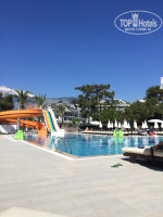 Вот у бассейна все занимали места с самого утра, бросали полотенца и шли кто на завтрак, кто обратно в номер. После 11 место было трудно найти, а после обеда и подавно. У бассейна днем в основном все развлечения: анимация, конкурсы, бары. Вода была чуть теплее чем в море. Есть две горки. Есть детский бассейн и детская площадка, а также детский клуб. Два бара.