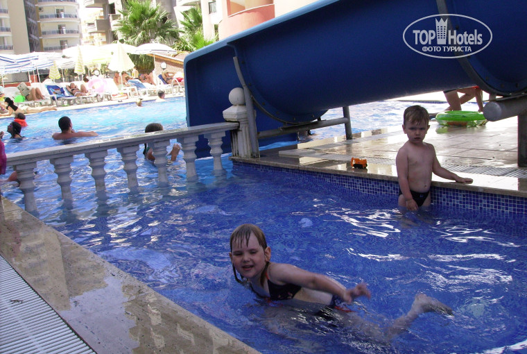 К плюсам отеля, пожалуй, отнесу: цена путевки - на 2008г. была очень демократичная, первая линия у моря, возможность размещения " всё включено", наличие, пусть детской анимации - вечернее детское диско, а также ненавязчивая взрослая анимация, трансферы на дискотеки в клубах Алании, в т.ч. пенная дискотека.