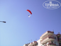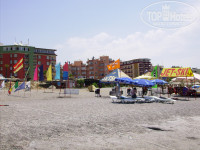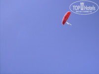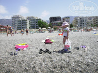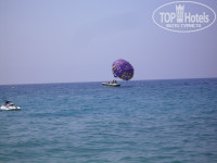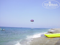 Отель располагается на первой линии, от моря территорию отделяет автомобильная магистраль, но под ней имеется удобный подземный переход. Пляж представляет собой или очень крупный песок, или очень мелкий галечник, вход в море достаточно комфортный средней крутизны. Недалеко восточнее от пляжа отеля располагается станция по экстримразвлечениям: катание на банане и на парашюте. Брали полет на парашюте)) по очереди, один летает, второй родитель приглядывает за дочей. Пилот катера уточняет с какого вы отеля и буксирует парашют именно на пляж вашего отеля, делает трюк с касанием ногами воды напротив отеля и снова взмываешь в небо. Очень понравилось, но некоторых посетителей укачивало.