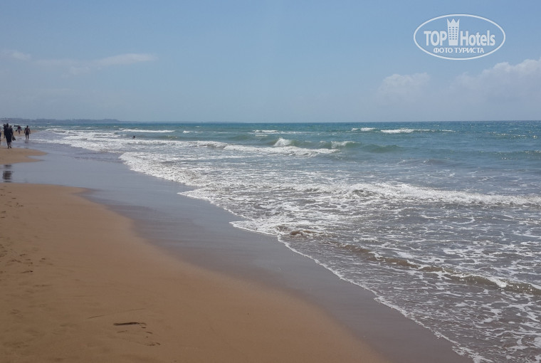 После знакомства со Спа, я пошла на море. Чтобы попасть на дорогу, ведущую к морю нужно пройти по территории отеля до водных горок. Дорожка вымощена тротуарной плиткой, с левой стороны небольшая речка, огражденная зеленой тканью, с правой стороны сельхозугодья соседнего отеля. Идти приблизительно 500-600 метров. В последние дни пребывания, стала ездить машина (по типу гольф кара) для туристов. Пройдя мостик, на котором постоянно толпился народ, вылавливая рыбу или фотографируя черепашек, уток и гусей, попала на пляж. Во время моего пребывания пляж еще приводили в порядок, но, полагаю, к открытию "высокого" сезона все уже будет готово. Красили стойки для тента, натягивали тент, подготавливали бар, убирали мусор из песка и т.д. Шезлонги, в целом, все в рабочем состоянии, зонтиков было мало и некоторые были сломанными. Заход в воду хороший как для взрослых, так и для детей - вначале мелко, потом глубина, затем снова мелко; без каменных плит, только песочек. В первые дни вода была прохладной, потом стала прогреваться и купались все без исключения.