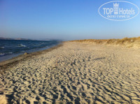 Про пляж: до него идти минут 5-7, пляж шикарный, белый песок, чистое море и теплое (Эгейское вроде)… На плаже есть бар, но всё платное! Загорали мы на песке на полотенцах под своим зонтом, по вечерам на лежаках бесплатно))) На море всегда было ветренно, к вечеру ветер усиливался, на надувном матрасе прикольно прыгать на волнах! Вид с пляжа был очень живописный, был виден противоположный остров, по вечерам также можно было наблюдать красивый закат!
