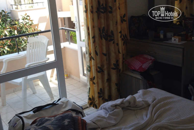 Пишу, пока воспоминания свежи. Вернулась из этого отеля вчера. Отдыхала с 11 по 22 мая 2015 года. Из 4 одинаковых по ценовой категории отелей выбирала тот, который предоставляет бесплатный интернет и прогадала))) первые три дня интернета не было вообще, а мне он необходим каждый день по работе. Потом настроили, но ловил плохо, в основном , рядом с ресепшен. Я заселилась в 508 номер, этот корпус ближе к выходу. Попросила Кямрана номер с видом на горы, не отказал. Заселения ждала часа 2. Первые 3 дня шли дожди. Погода комфортная для отдыха , но море холодное. За 12 дней купалась 3 раза. Убирались через день. Полотенце в номере одно, но везде продаются, это не проблема. На завтрак обычно были яйца, брынза, овощи и хлопья. На обед и ужин были супы-пюре, тушеные овощи, макароны, либо фасоль , из мясного -полуфабрикаты мясные, типа котлет, либо курица. Два раза жарили селедку на гриле, плюс салаты. Еда вкусная, но за 12 дней немного надоела) фруктов практически не было, пару раз апельсины и яблоки. Отель практически в центре, месторасположение хорошее. До пляжа далеко, ходит автобус. Я так до своего пляжа и не добралась, ходила поближе к отелю Crystal. Гостиница молодежная, при мне заселились 54 человека из Грузии, которые отжигали по полной, не считаясь с тем, что в отеле живут и пожилые и беременные. Музыка с танцами у бассейна была до 2 утра каждый день. Они еще и сами по себе очень шумные, так что с детьми туда ни ногой) вообще контингент отеля своеобразный очень. Пьют много и все, потом дерутся и шумят. Одному особо шумному и пьяному русскому турки разбили голову камнем, вызвали полицию. Не знаю, может мне так повезло)) цены на все не дешевые, мне показалось, что раза в 2 дороже, чем в Казани.