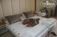 Отдыхали в этом отеле 20-30.05. с сыном 5 лет и мамой. В отель приехали в 12-30 и нас сразу заселили. Это большой плюс (для тех, кто не знает - время заселения в отель 14-00)!!! Номер дали отличный без каких-то доплат! На 3 этаже с видом на море (как и бронировали) и на соседний отель Пегасос Клаб 4*. Хочу заметить, что в этом отеле наверное 90% номеров имеют вид на море, оставшиеся 10% выходят на дорогу. Номер достаточно большой, чистый, уютный. В номере: 2 кровати и кресло-кровать для ребенка, хороший плоский телевизор (2 русских канала), кондиционер, стол, стул, мини-бар (пустой), 1,5 литра воды. Есть балкончик со столиком и 2-мя креслами, и сушкой для белья! В ванной комнате унитаз-биде, раковина, душ, фен. Из туалетных принадлежностей только жидкое мыло и шампунь (не пополнялся). В ванной комнате НЕТ РОЗЕТКИ!!!! Т.е. фен, эл.бритву и т.п. включить некуда!!!