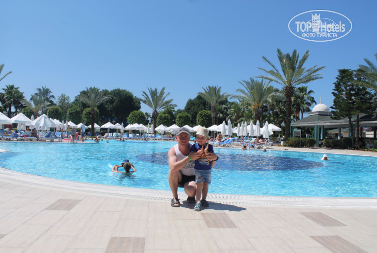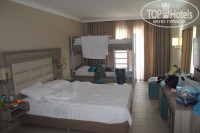 Прилетели в Анталию в 9 утра турецкого времени, час еще ждали в автобусе пока соберутся все туристы. В 10 выехали в сторону Алании, было 4 заезда в другие отели и наш 5-ый. Приехали в отель где то в 12-30, сразу не заселили, предложили сходить на обед. После обеда в 13-00 выдали карту-ключ от номера. Я сразу же попросил номер с двуспальной кроватью, т.к. знал, что есть двухместные номера с односпальными кроватями и вдруг сын ночью упадет если будет спать отдельно. Без проблем нам предложили семейный номер с двуспальной кроватью и еще с двухярусной, на которой сын очень весело играл :) .