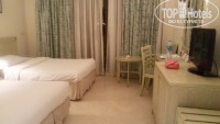 Заселяли не долго, надели браслеты (не люблю их, но никуда не деться, в отеле несколько систем питания), мальчик-носильщик проводил нас до номера, часть пути преодолевали на машинке, пока добирались сложилось впечатление что мы далековато от главного корпуса будем жить, но потом разобрались, оказалось что все рядом. НОМЕР (614) нам дали как мы и просили рядом с бассейном с горками, и рядом ресторан. В номере 2 кровати, 1 тумбочка, телевизор, стол с двумя стульями (в страшных пятнах), сейф, мини бар пустой, в рабочем состоянии, ванная комната с ванной и душем, рядом с унитазом душик прикреплен (типа биде на шланге), имеется также террасса на ней два стула и столик. В общем и целом такой обычный номер, но темновато, маловато все таки в номере осветительных приборов (две ракушки у зеркала и торшер на тумбочке), на террассе нет никакой сушки для вещей, как-то неудобно закрывается дверь в ванную (думала что не выйду оттуда, потом разобрались, нужно нажимать на кнопку) и дверь на террасу закрывается с трудом (тут просто нужно заменить замок), ну да ладно, это пережить можно, но вот то что в номере была одна свободная розетка - это конечно безобразие, приходилось отключать телевизор и/или торшер, что бы заряжать девайсы. Убирались в номере каждый день, меняли полотенца, приносили воду(1,5 литра), клали принадлежности в ванной комнате, меняли постельное белье.